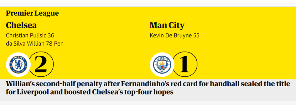 Sebab, kekalahan Manchester City berarti bahwa mereka tak mungkin lagi mengejar posisi Liverpool yang memiliki selisih 23 poin di atasnya. Liverpool menjadi jawara liga paling kompetitif dan bergengsi di dunia setelah menanti 30 tahun lamanya (Liverpool menjadi juara terakhir kali pada musim 1989-1990 ketika itu Mohamed Salah, salah satu penyerang andalan mereka, bahkan belum lahir).