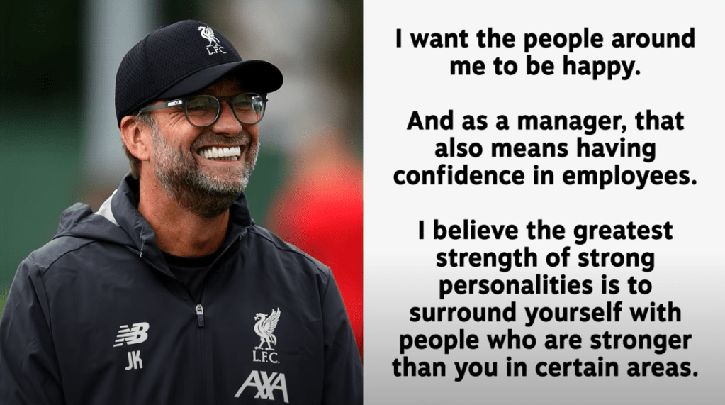 “Itulah kepemimpinan: miliki orang-orang hebat di sekitarmu dengan pengetahuan yang lebih baik di berbagai departemen dibandingkan dengan dirimu sendiri. Jangan bertindak seolah-lah Anda tahu segala hal. Bersiaplah untuk mengakui: ‘saya memang tak tahu apa-apa saat itu, beri saya waktu dan mungkin saya bisa menjadi tahu’. Itulah yang saya pahami, tapi itu bukan semacam filosofi. Itulah cara saya,” ujar Klopp dalam sebuah wawancara dengan Liverpoolfc.com.