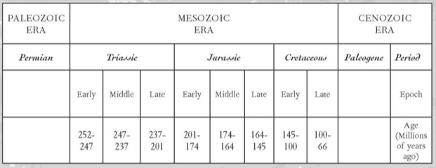Berakhirnya periode Permian (yang berada di ujung Era Paleozonic), menandai dimulainya Era Mesozoic, yang terdiri dari 3 periode – Triassic, Jurassic dan Cretaceous – yang tak lain adalah masa kebangkitan, kejayaan dan kehancuran dinosaurus. Era setelahnya, Cenozoic, atau “hidup baru”, merupakan masa kejayaan kelas mamalia, yang termasuk di dalamnya spesies kita, homo sapiens, penguasa bumi hingga hari ini.